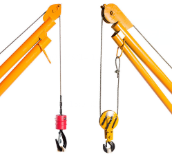 同一款小吊機(jī)其實是有兩種起重方式的,也就是單吊和雙吊。有留意觀察過的朋友應(yīng)該知道在小吊機(jī)吊臂接近末端處的下方位置是焊有一個吊環(huán)的,很多人不知道這個吊環(huán)的作用是什么,其實它就是用來完成雙吊的連接固定點。
